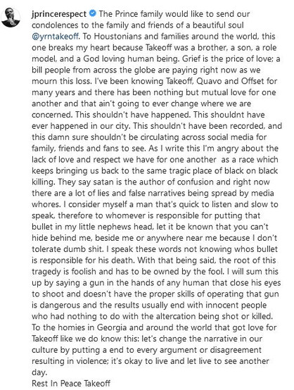 Well, look who has finally decided to come out of hiding and speak on the murder of Migos Rapper Takeoff, who was in Houston to celebrate with his sons J Prince Jr and Jas Prince. J Prince, who typically I find longwinded, actually said something to pique my interest: