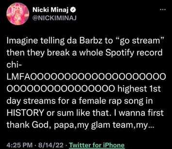 Well, one of Barbras said something to Cardi B, which provoked Bardi into a 2-word response, "Go Stream." Nicki then responded, "Imagine telling da Barbz to "go stream" then they break a whole Spotify record chi-"