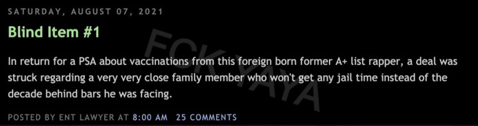 Per the Blind Item: "In return for a PSA about vaccinations from this foreign-born former A+ list rapper, a deal was struck regarding a very very close family member who won't get any jail time instead of the decade behind bars he was facing.