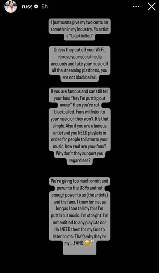 While Tory Lanez promotes his latest album by whining about no playlisting, as his songs sit on the most popular playlists on Apple Music, Russ says no artist is blackballed, "If you are famous and NEED playlists in order for people to listen to your music, how real are your fans?"